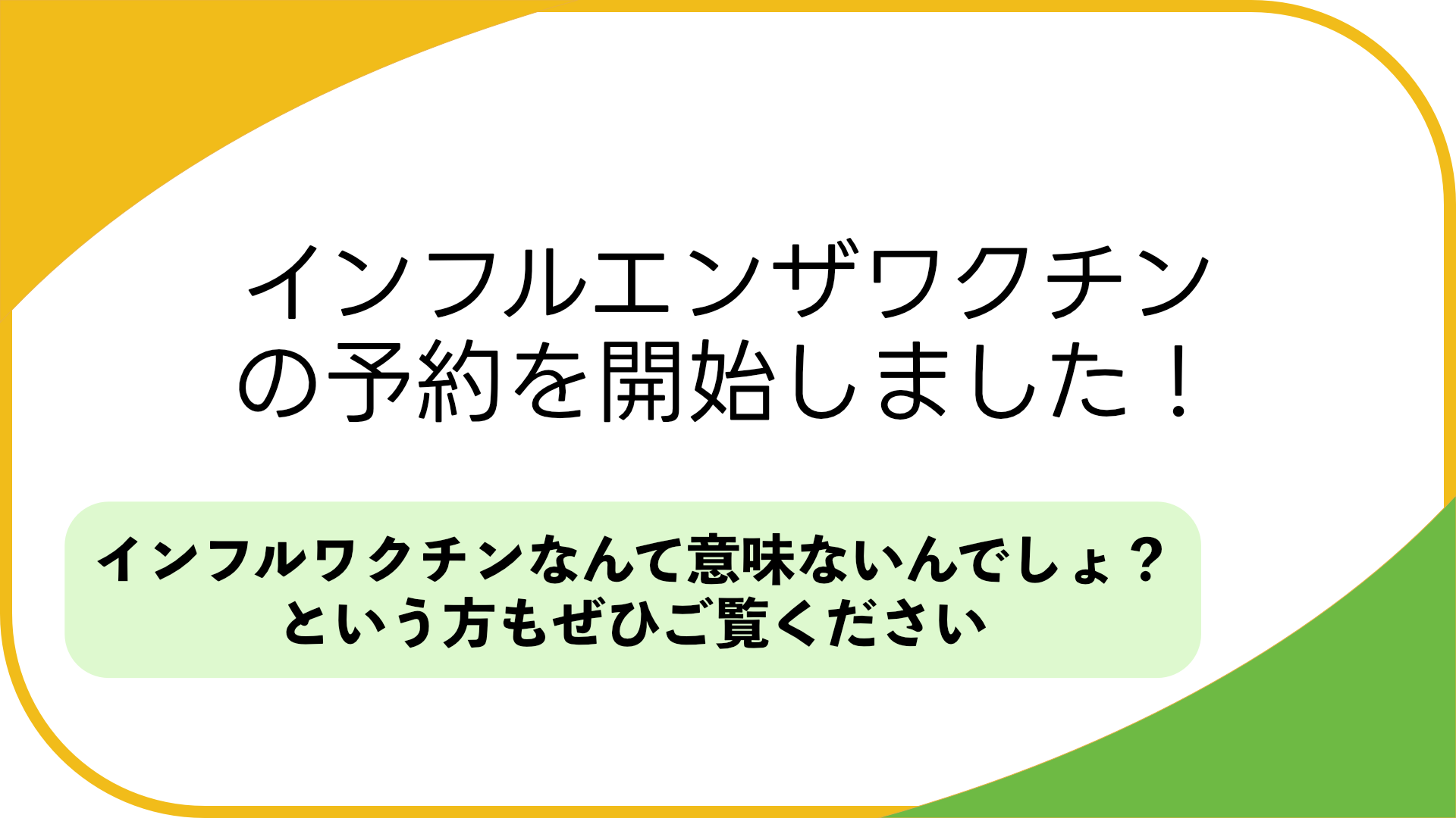 10月1日からインフルエンザワクチン接種専用の予約枠を設定します。当院で接種をご希望の方はいつもの予約画面から「インフルエンザワクチン」または「フルミスト」のメニューを選択し、ご希望の日時で予約をお取りください。